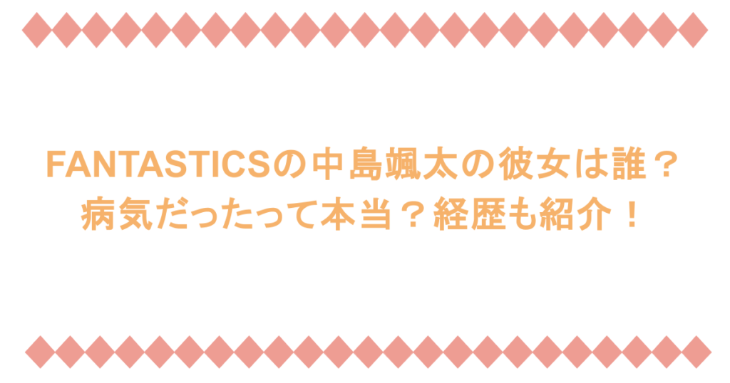 FANTASTICSのメンバーの中島颯太さんは、パフォーマーとしてとても人気がありますよね。そんな中島颯太さんに彼女がいるのかと、彼女事情について知りたいという声があがっています。また、病気だったという噂もあり、どんな病気なのかと心配される方も多... -